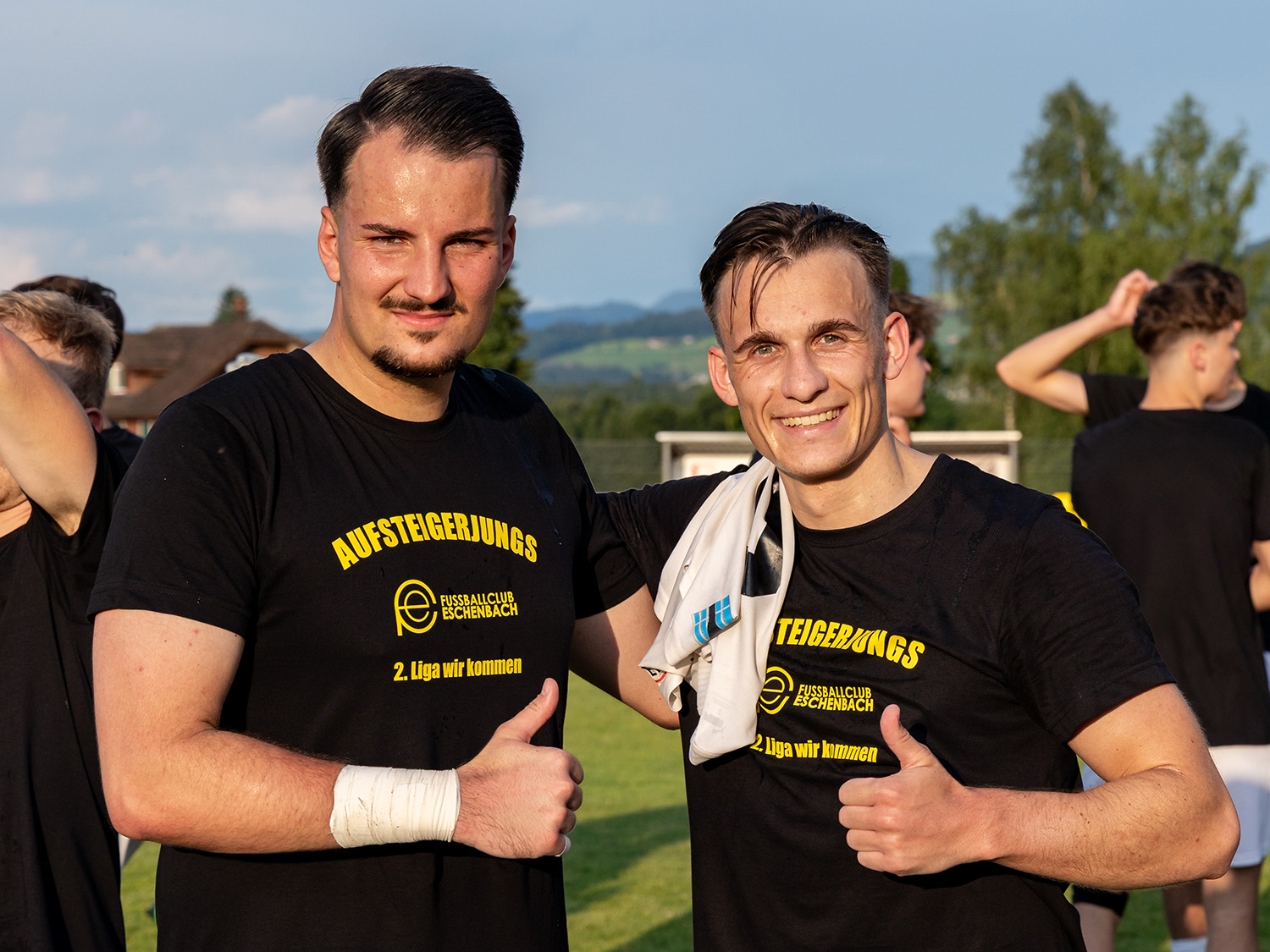 Doppeltorschütze Robin Niederberger (links) posiert mit Benjamin Barmet und dem Aufstiegsshirt. - Foto: Daniel Gerber (FC Eschenbach)
